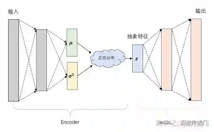 Vairational AutoEncoder(VAE)是Kingma等人与2014年提出。VAE比较大的不同点在于:VAE不再将输入x映射到一个固定的抽象特征z上,而是假设样本x的抽象特征z服从(μ,σ^2)的正态分布,然后再通过分布生成抽象特征z。最后基于z通过decoder得到输出。模型框架如下图所示: