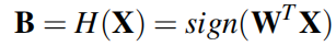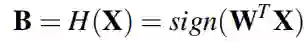 注:B是学习目标,即哈希编码,H(x)是哈希函数,X是数据集,sign 是符号函数,W是投影矩阵。