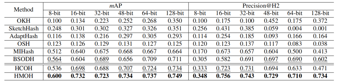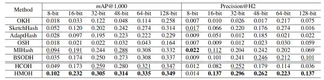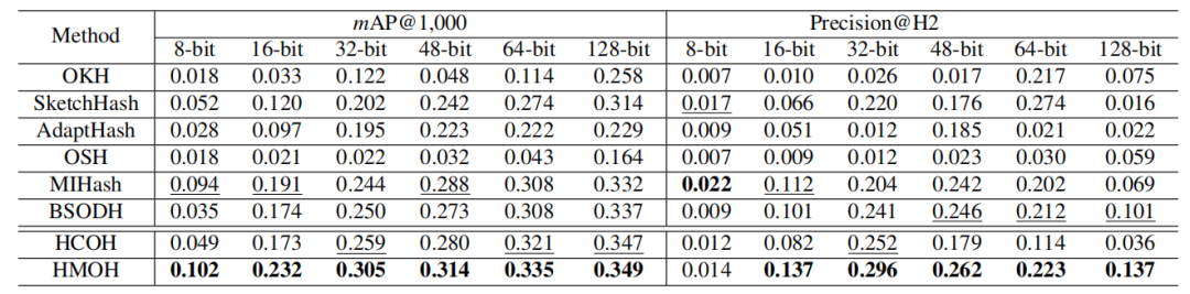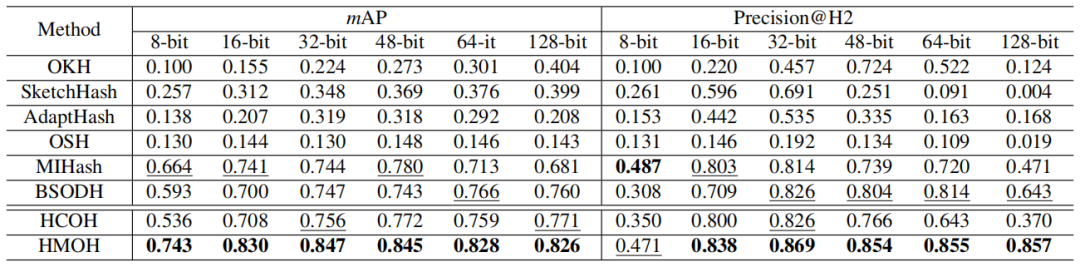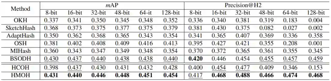 评价指标有两个,分别为:mAP( mean Average Precision)、Precision@H2(Precision within a Hamming ball of radius 2)。比较的基准方法有七个,分别为:OKH、SketchHash、AdaptHash、OSH、MIHash、BSODH、HCOH。