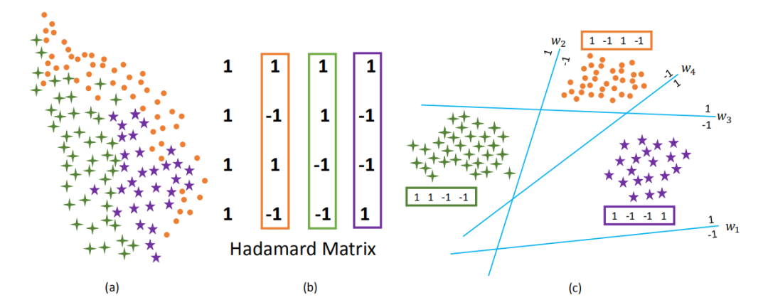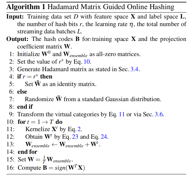 不同于传统的方法,该方案进行哈希编码的时候仅仅只需要利用当前阶段的流数据,因此学习效率在每一阶段都是恒等的。为此,作者把具有正交性质的哈达玛矩阵作为同一类流数据的目标编码,目标编码进一步作为感知机的虚拟类别来学习分类器。