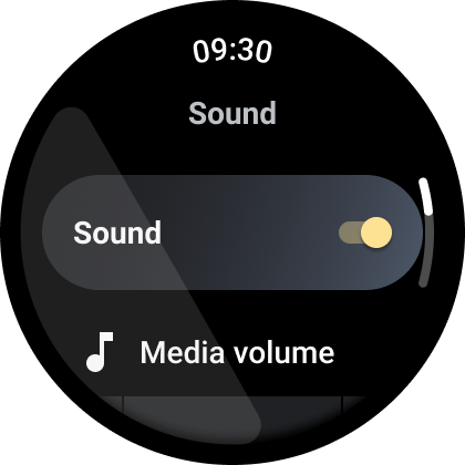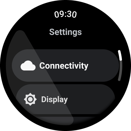 Scaffold 提供了布局结构,以帮助您像移动设备一样,用常见模式排列屏幕,但并非应用栏、悬浮操作按钮 (FAB) 或抽屉式导航栏等模式。Scaffold 可支持 Wear 专属布局,并提供时间、曲线文本样式及滚动/位置指示器等顶层组件。