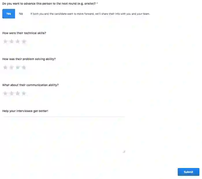当我们开始允许雇主通过我们的平台进行招聘时,我们只是重复利用了这个面试后反馈格式,告诉他们留下反馈意见以帮助我们进行校准,因为这对求职者的体验很有帮助,我们热切地希望各公司能够配合。