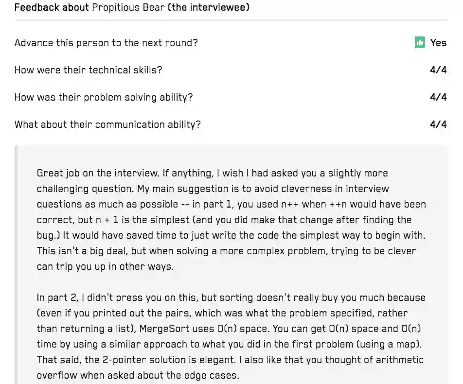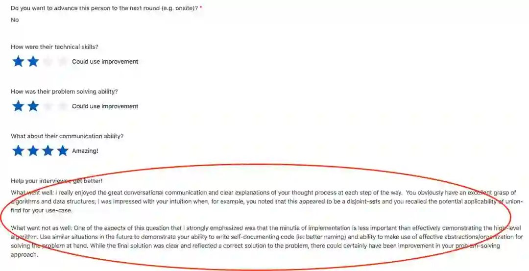 而根据我的经验,不说原因就直接结束面试要比让候选人明白原因更尴尬,而且不说原因的话更容易引起候选人的敌对心态。某些候选人可能会为自己争辩(此时您可以礼貌地结束通话),但是如果您给候选人提供建设性的反馈意见——让他们知道是哪里出了问题,建议他们去读哪些书,推荐他们去刷Leetcode之类的题库,等等。大多数人将不胜感激。我个人提供反馈的经历体验都是非常正面的。我曾经很喜欢给应聘者寄书,并且我与其中的许多人一直保持着联系。几年后,其中的有些人成为了Interviewing.io的早期用户。