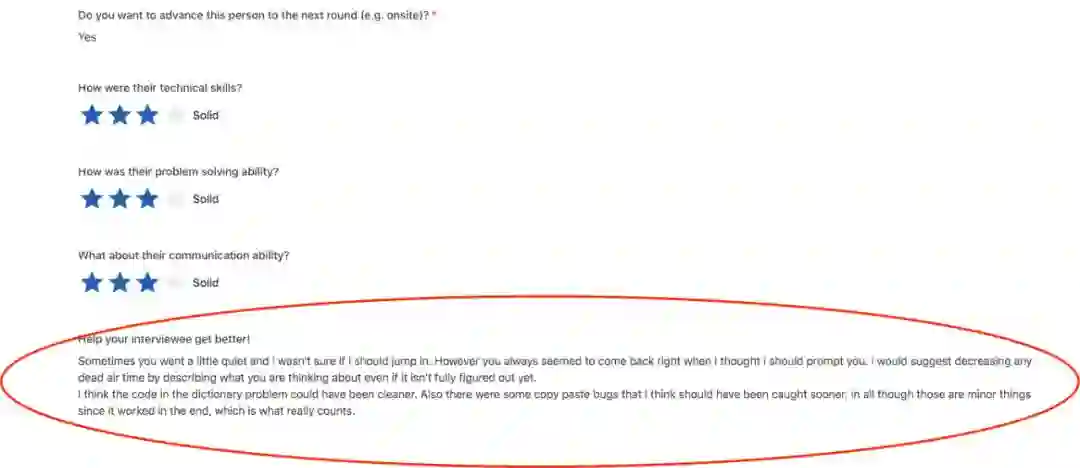 在开始与雇主合作之前,我们花了一些时间来建立自己的练习平台以及合适的机制。对于面试练习,我们的面试后反馈表格如下: