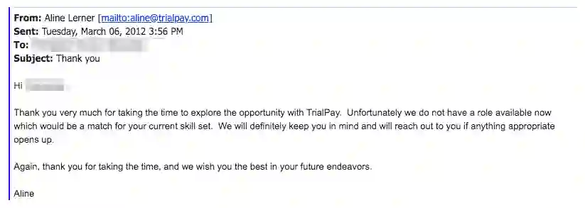 欸,其实我也做过这种事。下面的截图是我在TrialPay担任技术招聘负责人时写的一封拒绝电子邮件。这封电子邮件使我想回到过去,朝着自己的脸抡一锤,然后祝自己在未来的工作中不要再犯这种错误了。