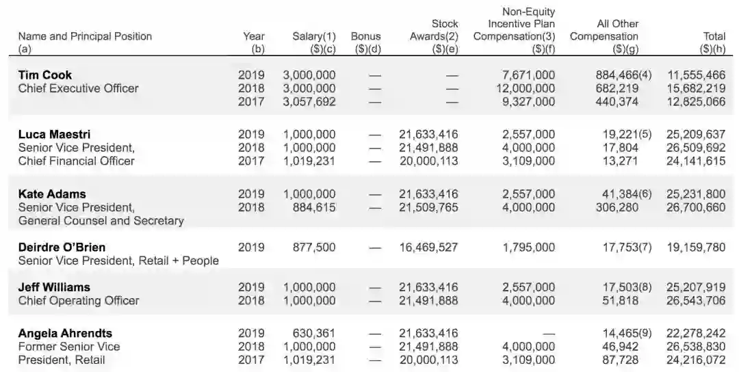 苹果CFO卢卡·马埃斯特里、首席法律顾问凯特·亚当斯和COO杰夫·威廉姆斯的非股权奖金,都从400万美元降至260万美元。