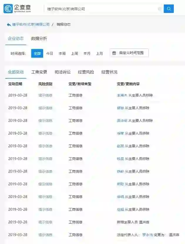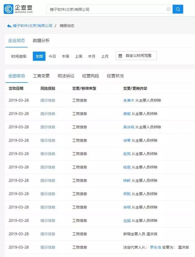 3月28日,根据企查查官网数据显示,锤子软件(北京)有限公司发生工商信息变更,法定代表人由罗永浩变为温洪喜,前锤子科技CTO钱晨、陌陌CEO唐岩以及朱萧木、赵亮、应超、辛明、铁岭、郑刚、徐寒、吴泳铭10位高管从主要人员中移除。