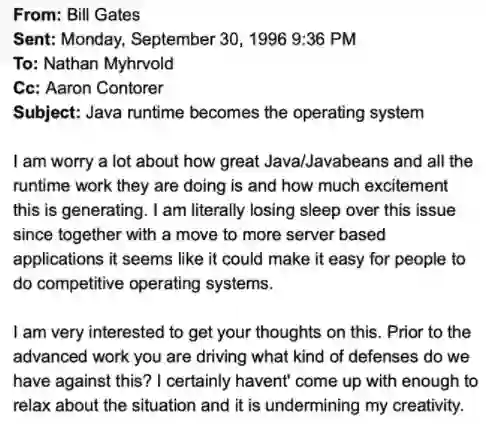 从此前公布的资料来看,比尔·盖茨虽然第二天就看似冷静地回复称应先了解 Java 对微软操作系统的影响何在,但本周四 @TechEmails 在推特上公布了当时的更多细节:1996 年 9 月 30 日晚上 9:36,比尔·盖茨给当时身为微软 CTO 的 Nathan Myhrvold 发了一个邮件,主题为“Java 运行时成为操作系统”,并表示“我真的为此失眠了”。(注:Nathan Myhrvold 曾在微软工作 14 年,于 2000 年辞职,后与 Edward Jung 共同创办了美国知识风险公司 Intellectual Ventures,担任 CEO 一职。)