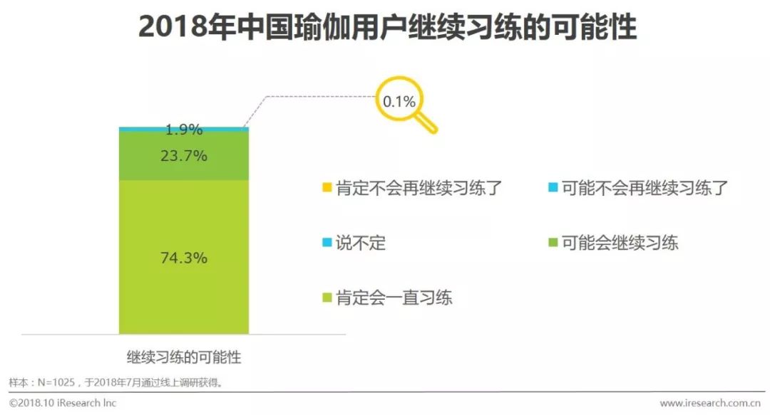 本次调研数据显示,中国瑜伽用户人群中,仅有0.1%表示今后肯定不会继续习练瑜伽,74.3%的用户表示肯定会习练。同时,该类人群期待瑜伽品牌提供更优质的课程,包括局部深度练习课程及更高质量的课程。该数据说明,瑜伽用户的忠诚度极高,一旦为其提供了优质服务,用户流失率将大大低于其它类运动。