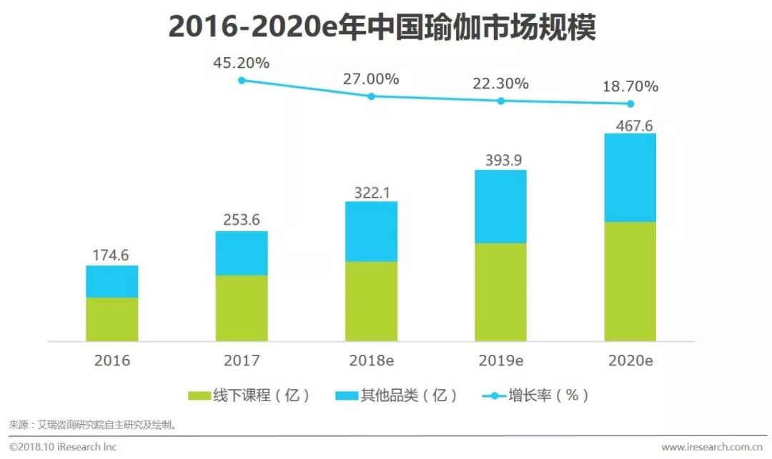 艾瑞认为2018年瑜伽市场规模将到达322.1亿元,增长主要来自瑜伽垂直产品(服装、瑜伽垫、辅具等)等产品。2015-2017年,瑜伽的增长主要来自高速增长的泛人群及核心人群,以及线下瑜伽馆及工作室的课程收入。2018年后瑜伽市场基于核心人群的快速增长而产生的规模增长正在减弱。同时,现阶段线下瑜伽馆与工作室之间以价格竞争为主,客单价的提升有限。