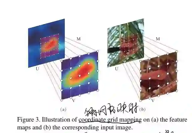 一般的,空间转换层所输出的attention region 的特征被记住fk。这里需要一个空间转换矩阵 M(最开始的时候这个参数是我们给定的,而接下的时候是慢慢去学习的,这个在上面的图中也有具体的展示),现在我们有了fk的坐标,所以就能得到在fi中的坐标网格了。 然后呢,包含attention region的fk就能够通过双线性插值来产生了。如下图所示。