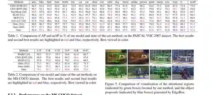 接下里作者就大概介绍了下现在CNN所取得进展。然后那些传统的hypothesis region 的方法他们的缺点就是:大量计算,并且忽略了上下文之间的联系,以及标签之间的相互依赖联系(笔者:这里解释下,就比如出现了鸟,很大一部分会出现树木,或者天空,他们都是有一定的联系关系的,这就不可避免的要使用lstm)。虽然王(16年cvpr文章,这个后面我也会具体读一下的)在16年提出了CNN-RNN的方案用来解决标签之间的关系的问题。但是却忽视了标签和区域之间的联系,并且缺少探索空间背景。所以作者的对比目标就出来了,提出一个端到端的网络,然后能够得到基于语义标签的注意力区域,并且能够从一个全局的视角捕捉到上下文的标签的依赖性,并且他们的模型并不需要输出假定框。