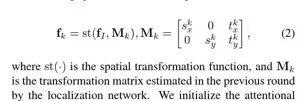 作者在这里简单的介绍了下空间转换层的用法。空间转换层是一个基于样本的鉴别模块,能够在空间上把输入映射转换成输出映射(对应着输入映射的一个小块分区)。而且呢,ST模块能够很方便的在网络中进行训练,并且进行反向传播。在作者的模型中,ST模块被放入循环记忆模块用于attention region区域的定位。