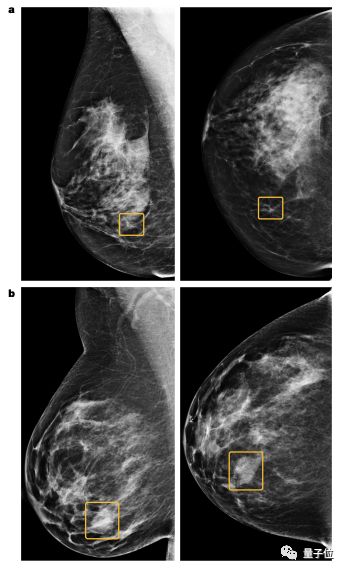 b图中的大密度块状恶性肿瘤被6位放射科医生识别出来,但是AI却没有识别出来