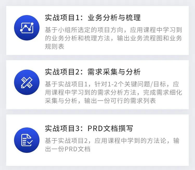 课程会围绕“分析/梳理业务 → 洞察需求 → 产品设计 → 开发与实施 → 迭代与运营 → 产品架构设计“等核心内容展开,帮助你掌握全流程工作要点,同时学会将所学内容运用到具体的工作中去。