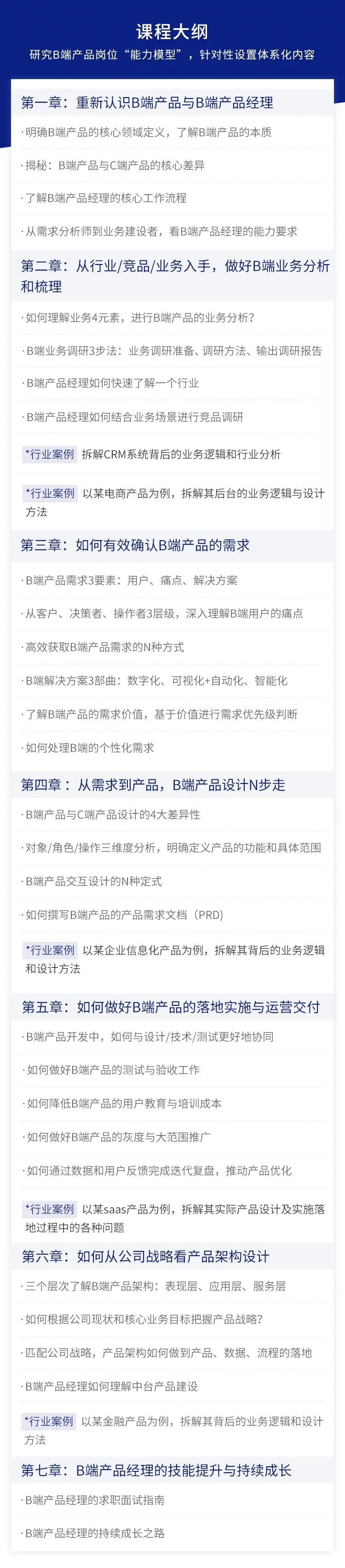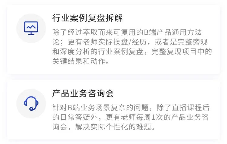 所以除了详细的学习内容,课程考虑到B端业务场景的复杂性,除了日常答疑,课程配有还有5大行业案例复盘拆解(涵盖CRM系统、电商、企业信息化、saas、金融等领域)、12场产品业务咨询会,帮助你有效解决实际难题。