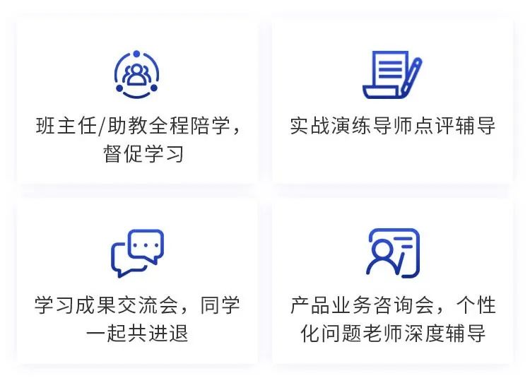 全程直播授课+12场产品业务咨询会+12场学习成果交流会+微信班级群交流;全程由班主任和助教带班,老师全程教学辅导。详细学习流程如下: