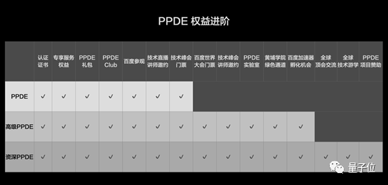 当然,技术和进步是开源永恒的主题,百度PPDE也设置了特色进阶成长体系。当你的技术水平和开源贡献不断提升时,可以不断进阶解锁新的权益!你甚至有机会参与全球游学、顶会交流等,有机会进入百度孵化器及核心AI人才培养计划,还有机会参与顶级项目支持,比如拥有1000万基金、1000万算力、100亿流量加持的星辰计划等,成长为真正的顶级专家!