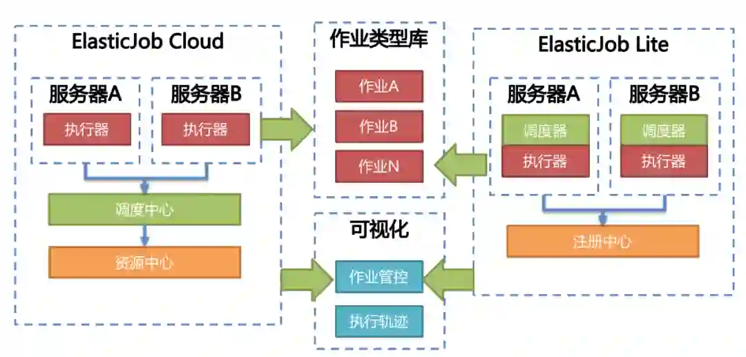 ElasticJob 的调度模型划分为支持线程级别调度的进程内调度 ElasticJob-Lite,和进程级别调度的ElasticJob-Cloud。
