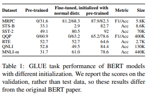 如下表所示,对使用正太分布中随机采样得到的权值初始化的 BERT 进行调优,其性能得分始终低于使用预训练权值初始化的 BERT。然而,在某些任务(如 MRPC )上,性能的下降并不太显著。