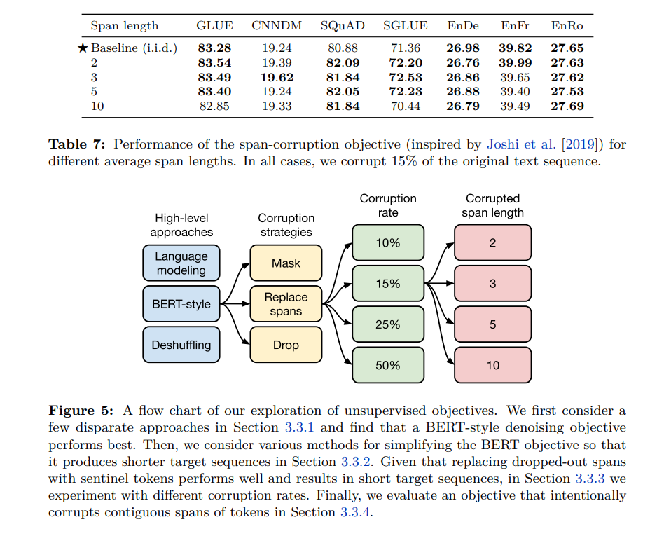 针对任务的目标序列长度,论文「Exploring the Limits of Transfer Learning with a Unified Text-to-Text Transformer」进一步指出,将丢弃的跨度区间长度选择为 3 是较为合适的。具体而言,作者将平均跨度区间设置为 3,原始序列的丢弃率设置为 15%。他们发现这种目标可以得到较好的性能,此时由于目标序列长度较短使得计算效率较高。