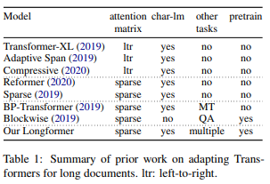 Longformer 使用了一种计算时间可以线性地随着序列长度增长而增长的注意力机制(窗口化的局部上下文的自注意力和由终端任务激活的全局注意力)。