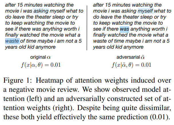 作者在各种各样的 NLP 上进行了大量的实验,发现注意力机制并不能恰当地与输出相关联。例如,学习到的注意力权重往往与基于梯度的特征重要性度量无关,我们可以发现有些差异非常大的注意力分布可以产生相同的预测结果。因此我们不能认为模型是由于注意力机制才取得了优秀的性能。