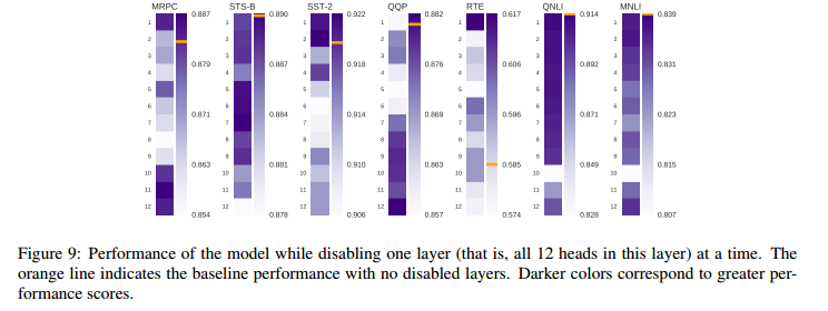 在论文「Revealing the Dark Secrets of BERT」中,作者指出,去掉整个一层的注意力(即给顶层中的 12 个注意力头),也会提升模型的性能。如下图所示,当去除不同的层时,在识别文本蕴含(RTE) 的任务中,去掉第一层注意力会取得极其显著的性能提升(3.2%)。
