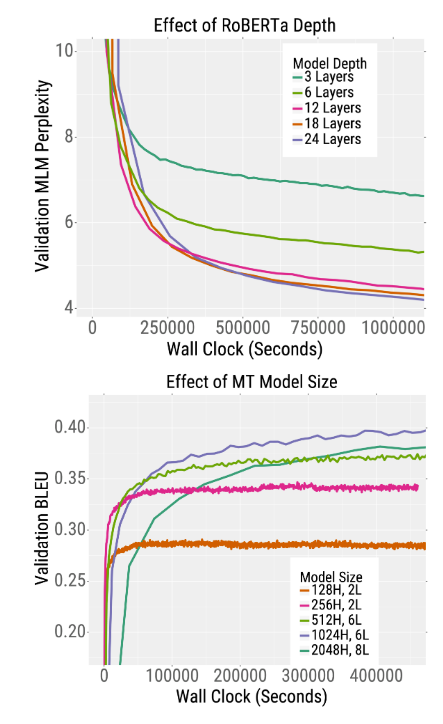 博文「Speeding Up Transformer Training and Inference By Increasing Model Size」指出,较大的模型可以更快地获得更高的准确率。对于预训练 RoBERTa,增加模型宽度和 / 或深度都会导致训练地更快。对于机器翻译任务,更宽模型比更深的模型更有效。