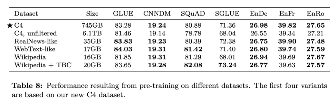 这篇论文指出,当数据量达到一定规模时,数据的质量比数据的数量对于模型性能的提升更加重要。如下图所示,未过滤的 C4 数据集规模达到了 6.1 TB,过滤后的 C4 数据集规模则为 745GB。然而,在过滤后的 C4 数据集上,预训练模型的各项指标均优于未过滤的情况。