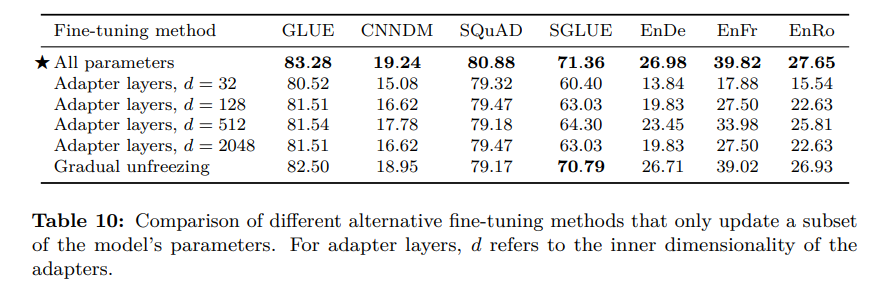 下图为使用不同的模型参数子集的情况下,不同调优方法的对比。对于适配器层来说,d 代表适配器的内部维度。