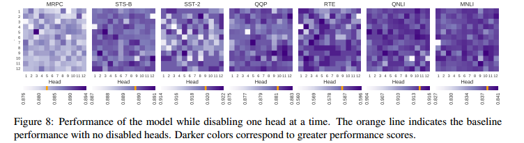 实验结果表明,不同的注意力头会重复一些特定的注意力模式,这说明模型存在过参数化的现象。尽管不同的注意力头会使用相同的注意力模式,但是他们在不同的任务上对性能有不同的影响。作者指出,手动去掉某些注意力头的注意力,一般会使得条右后的 BERT 模型获得性能的提升。