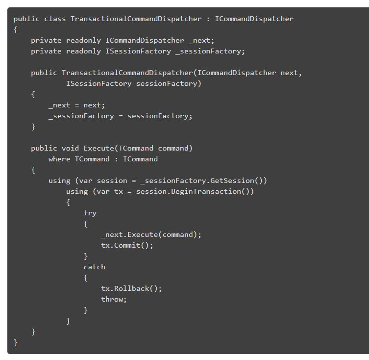 就像我说的,这个实现是可以扩展的。例如,我们可以为命令 dispatcher 引入事务,而无需通过创建 decorator 来改变原始实现。