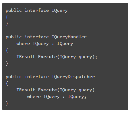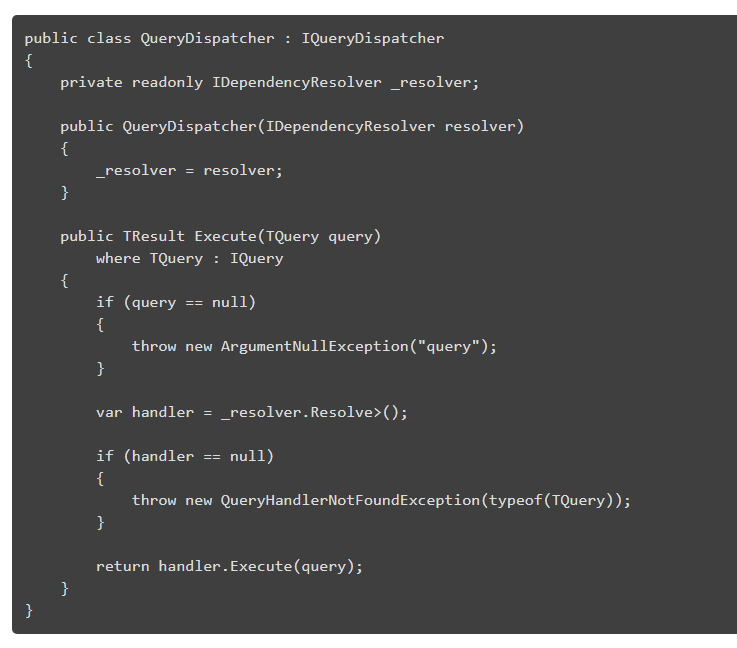 就是这样。QueryDispatcher 看起来很相似,唯一不同是它返回了一些数据,多亏了我之前写的通用代码,Execute 方法返回强类型结果: