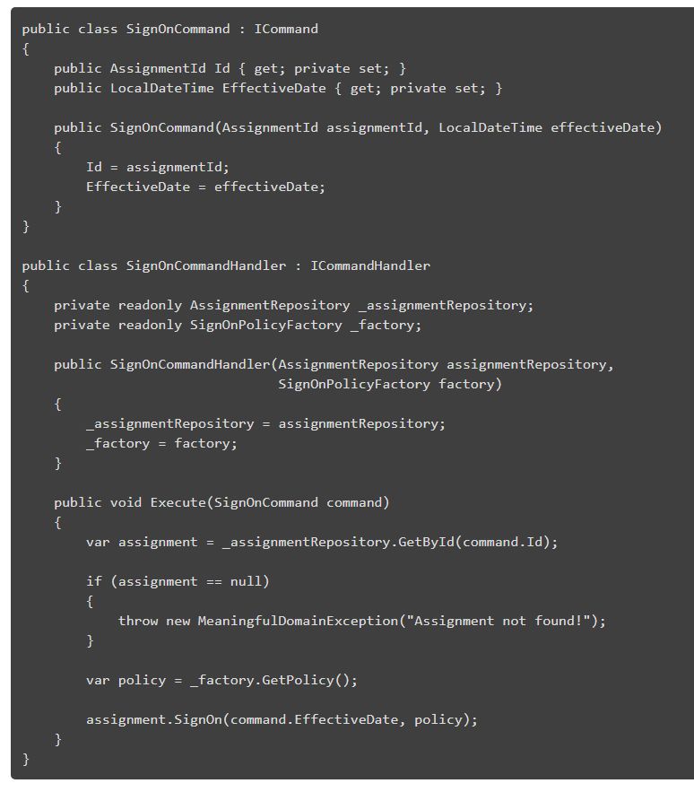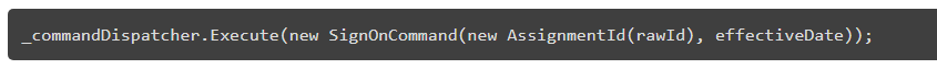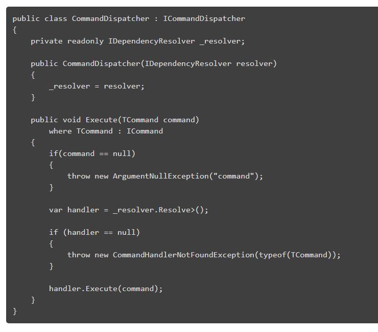 我的 CommandDispatcher 相当短,它只负责为给定的命令实例化适当的命令助手并执行它。为了避免手动输入命令去注册和实例化,我已经使用了 DI 容器来做这件事,但如果你不想使用任何 DI 容器,你仍然可以自己做。我说过,这个实现将是简单的,我相信是这样。唯一的问题可能是泛型引入的噪音,它可能刚开始的时候会令人沮丧。这个实现在使用上确实是简单的。下面是一个命令和助手的示例: