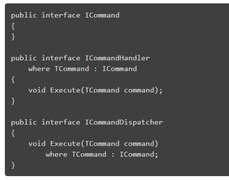 我定义几个接口描述命令和他们的执行环境。为什么我用两个接口来定义一条命令?我这么做是因为我想要保持参数为普通对象,这样就可以不用任何依赖来创建。我的命令 handler 可以从 DI 容器中请求依赖,而且除了在测试中,不需要在任何地方实例化。事实上,ICommand 接口在这的作用相当于标记,来告诉开发者他是否可以将这个类作为命令来使用。