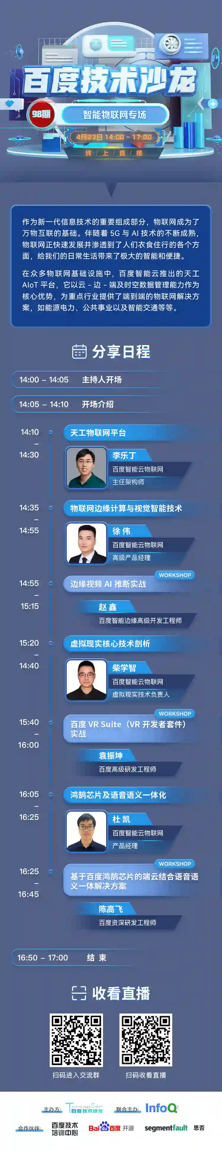 为了给大家分享更多与智能物联网有关的前沿技术干货,4 月 23 日,百度技术沙龙第 98 期将以“智能物联网”为主题,我们邀请到了百度智能云物联网主任架构师李乐丁、百度智能云物联网高级产品经理徐伟、百度智能云物联网虚拟现实技术负责人柴学智以及百度智能云物联网产品经理杜凯,带你深度解析百度智能云物联网的核心技术优势。活动中还将结合实际产品进行演示,为各领域开发者实现业务创新提供新的操作思路。
