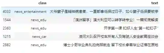 首先是载入文本。这里的文本来自今日头条,类别有教育、科技、娱乐和汽车,文本部分仅取标题。最终得到的数据包括文本、经过预处理的文本、标签ids。