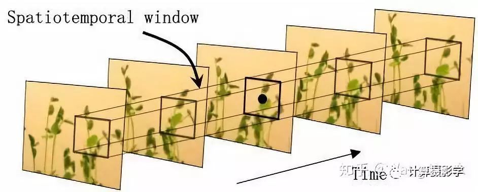 因此,作者提出可以在时间和空间上构成滑动窗口,并在窗口内对图像中进行平滑,下图是作者提到的“时空窗口”示意,黑色点是需要计算的像素点,计算是在一个时间帧和空间区域构成的立方体上进行的。