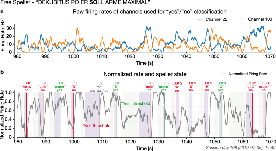 2022年3月22日,瑞士「Wyss生物与神经工程中心」与德国图宾根大学发表研究,以植入式脑机接口,首次让一名已无法控制随意肌、连眼睛也不能移动的完全闭锁状态患者,成功以大脑讯号选择字母并组成句子。