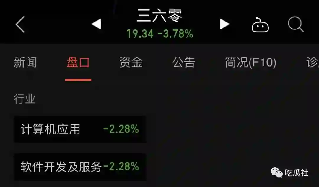 年报发布当日,360股价下跌3.78%,跌幅超过它所在的计算机应用、软件开发及服务行业盘口。