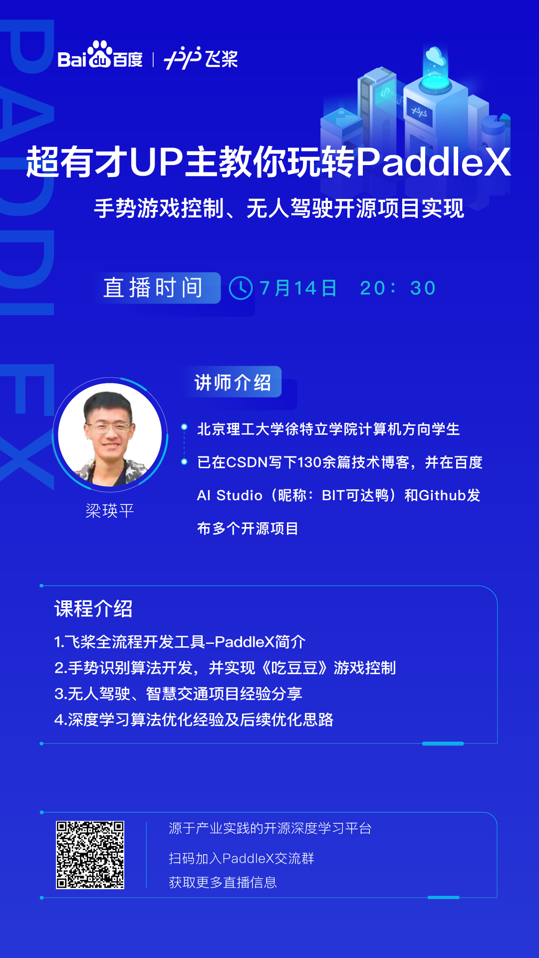 7月14日(周二)20:30,飞桨官方账号将在B站为大家直播讲解飞桨全流程开发工具PaddleX的具体技术特点与实践流程,感兴趣的同学可扫描以下海报上二维码入群,获取更多直播资讯。