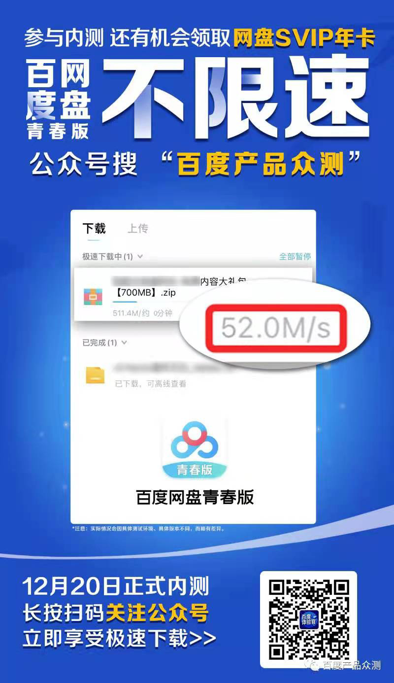 百度网盘是目前国内仅存几种网盘之一了,只是因为带宽成本问题,非会员的限速问题一直被人吐槽,前不久在工信部的要求下,百度也宣布推出号称不限速的百度网盘青春版,原定下周内测。曝光的宣传材料显示,百度网盘青春版计划下周一 12 月 20 日开始内测,安卓、iOS 平台都有,数据可以互传。