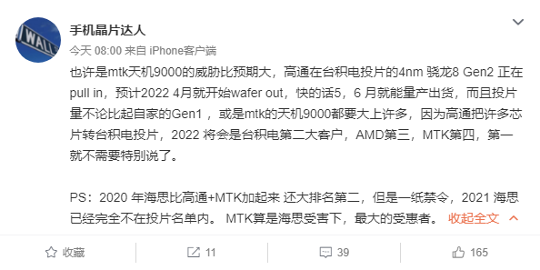 他还表示,目前高通骁龙 8 Gen2 的投片量不论比起自家的 Gen1 ,或是联发科天玑 9000 都要高出许多。据称,高通已经把大量芯片代工订单从三星转向台积电投片,预计将成为台积电 2022 第二大客户(苹果第一,AMD 第三,MTK 第四)。