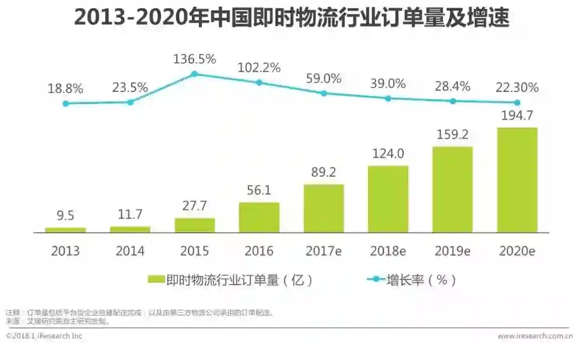 消费升级的主要表现之一,在于消费者对消费体验期望值的增加。即时物流由于快捷、便利的典型优势受到消费者的热捧,需求逐渐提升。2017年中国即时物流行业整体订单量预计达到89.2亿,增幅相较16年有所下降,但仍保持59.0%的较高增速。