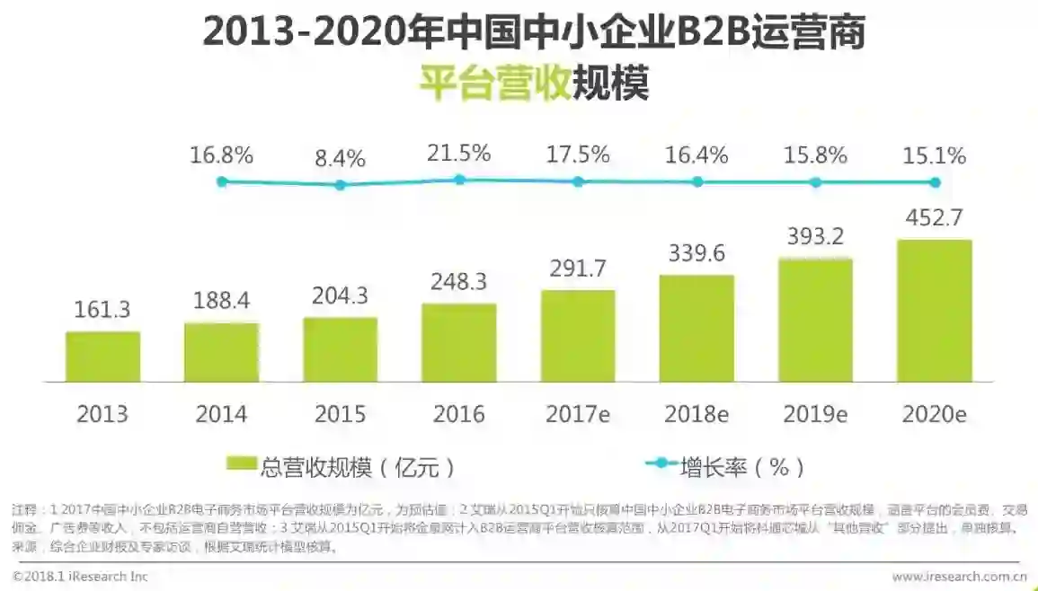 根据艾瑞咨询最新统计数据,2017年中国中小企业B2B运营商平台营收规模预计为291.7亿元,同比增长17.5%。