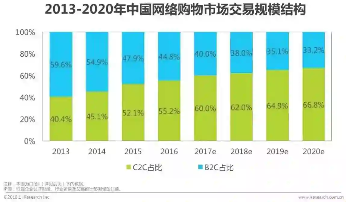 艾瑞咨询的研究数据显示,2017年中国网络购物市场中B2C市场交易规模预计为3.6万亿元,在中国整体网络购物市场交易规模中的占比达到60.0%,较2015年提高4.8个百分点;从增速来看,2017年B2C网络购物市场增长40.9%,远超C2C市场15.7%的增速。