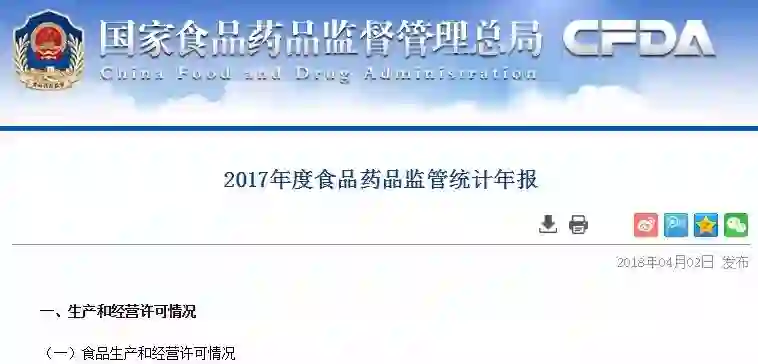 4月2日,CFDA发布了《2017年度食品药品监管统计年报》,对从2016年12月1日至2017年11月30日内食品、药品、器械、化妆品生产和经营许可情况、注册审批情况、广告审批和查处情况、中药品种保护情况、投诉举报情况、案件查处情况作了统计(婴幼儿配方乳粉产品配方注册申请数据与特殊医学用途配方食品注册申请数据截止日期为2017年12月31日),具体内容如下: