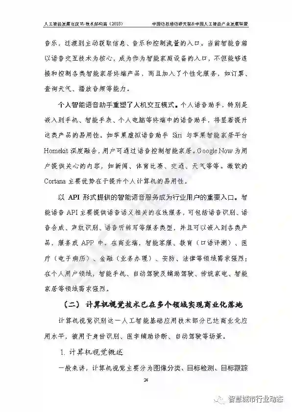 第三,系统梳理了基于深度学习的智能语音,计算机视觉,自然语言理解这三大基础应用技术及其发展的现状、应用领域。