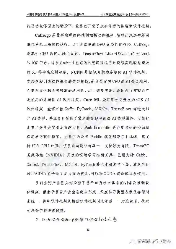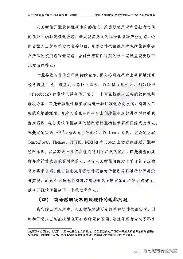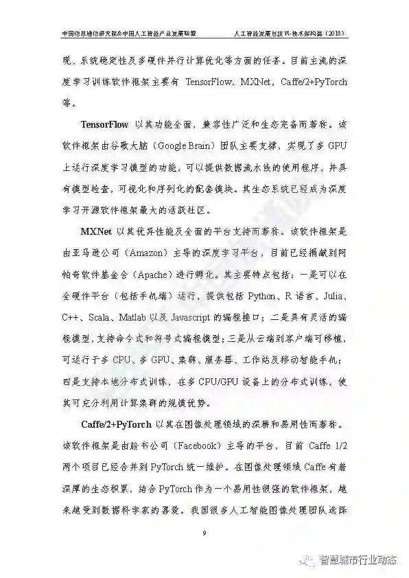 第二,围绕算法,数据和算力的“三驾马车”,分析了机器学习算法、AI加速芯片、训练及推断数据、软件框架、编译器等基础技术的基本情况、现状和特点;